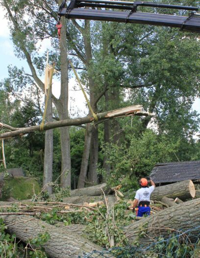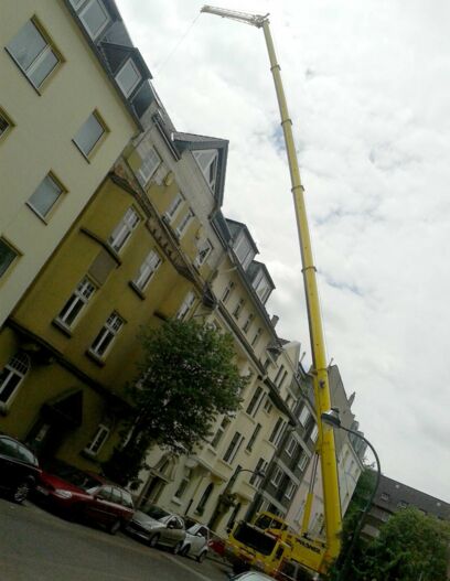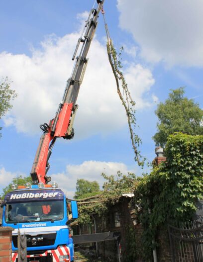 Kranfällungen kommen dann zum Einsatz, wenn der Baum mit einer Bühne nicht erreicht werden kann und eine Fällung mittels Seilklettertechnik nicht möglich ist. Dies ist der Fall bei kranken oder schon abgestorbenen, stark bruchgefährdeten Bäumen oder bei massiven Sturmschäden. Kranfällungen sind sehr aufwendige und kostspielige Verfahren, bei denen viele Parameter berücksichtigt werden müssen. Gerade bei Sturmschäden ist es aber oft die einzige Methode, um z.B. einen abgebrochenen Baum aus der Fassade zu ziehen oder den Stamm vom Garagendach zu heben. Der Vorteil einer Kranfällung ist die Zeiteffektivität. Es ist meistens die schnellste Methode einen Baum zu fällen.